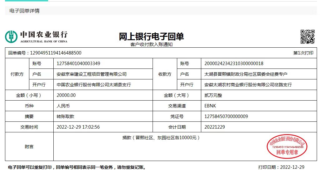 岁末寒冬,安徽京审公司向晋熙社区、东园社区各捐赠10000元,以助力社区疫情防控,更好地为民服务。