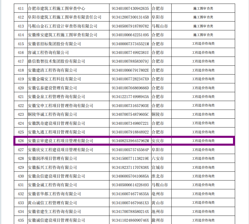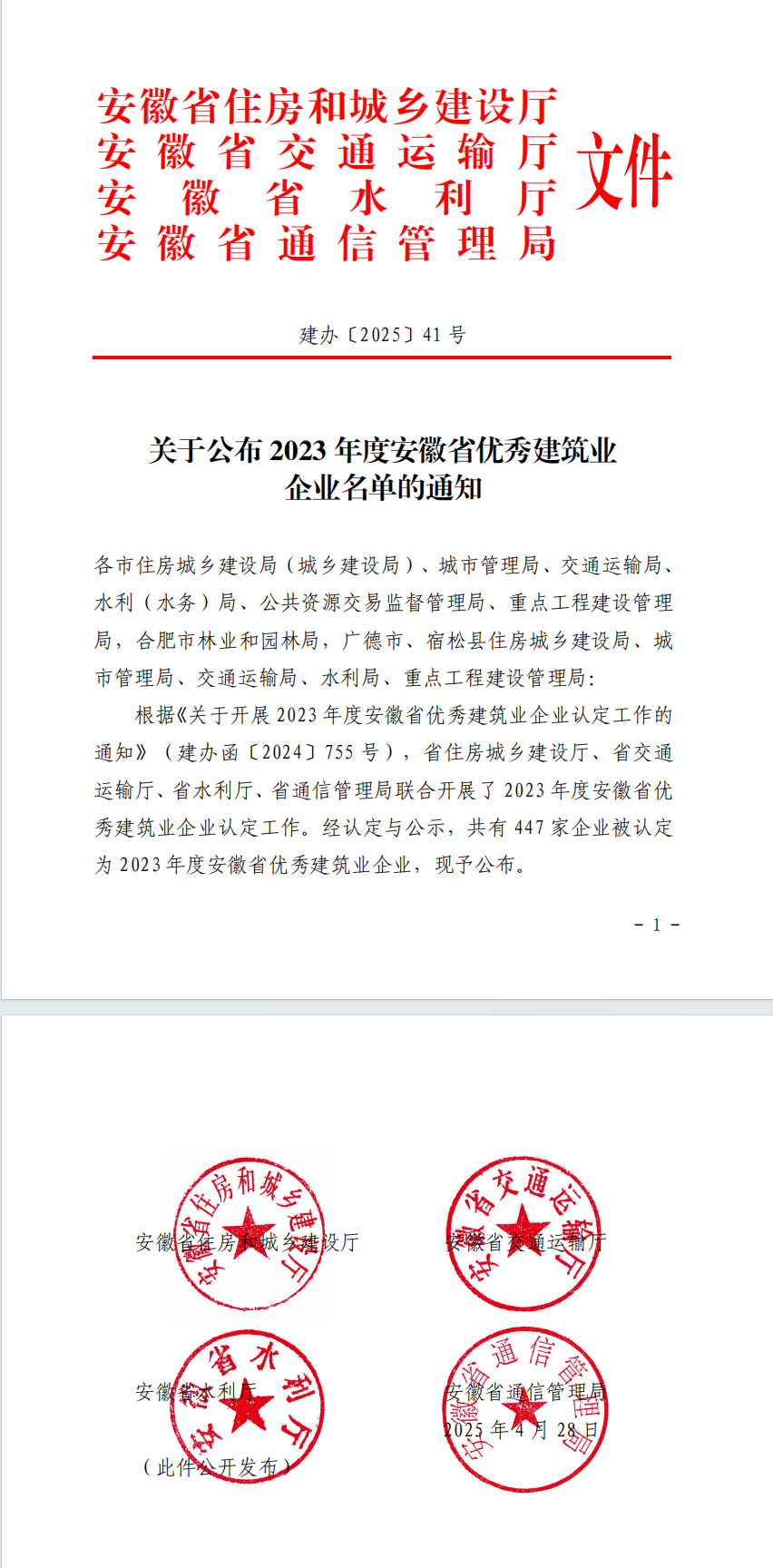 在安徽省住房城乡建设厅、省交通运输厅、省水利厅、省通信管理局组织开展的2023年度“安徽省优秀建筑业企业”认定工作中,近日公布结果,安徽京审建设工程项目管理有限公司凭借在工程造价咨询领域的专业实力、卓越服务与创新实践,连续四年(2020-2023)获评“2023年度安徽省优秀建筑业企业”荣誉称号!成为安庆市唯一一家四度摘得“安徽省优秀建筑业企业”称号的造价咨询企业!